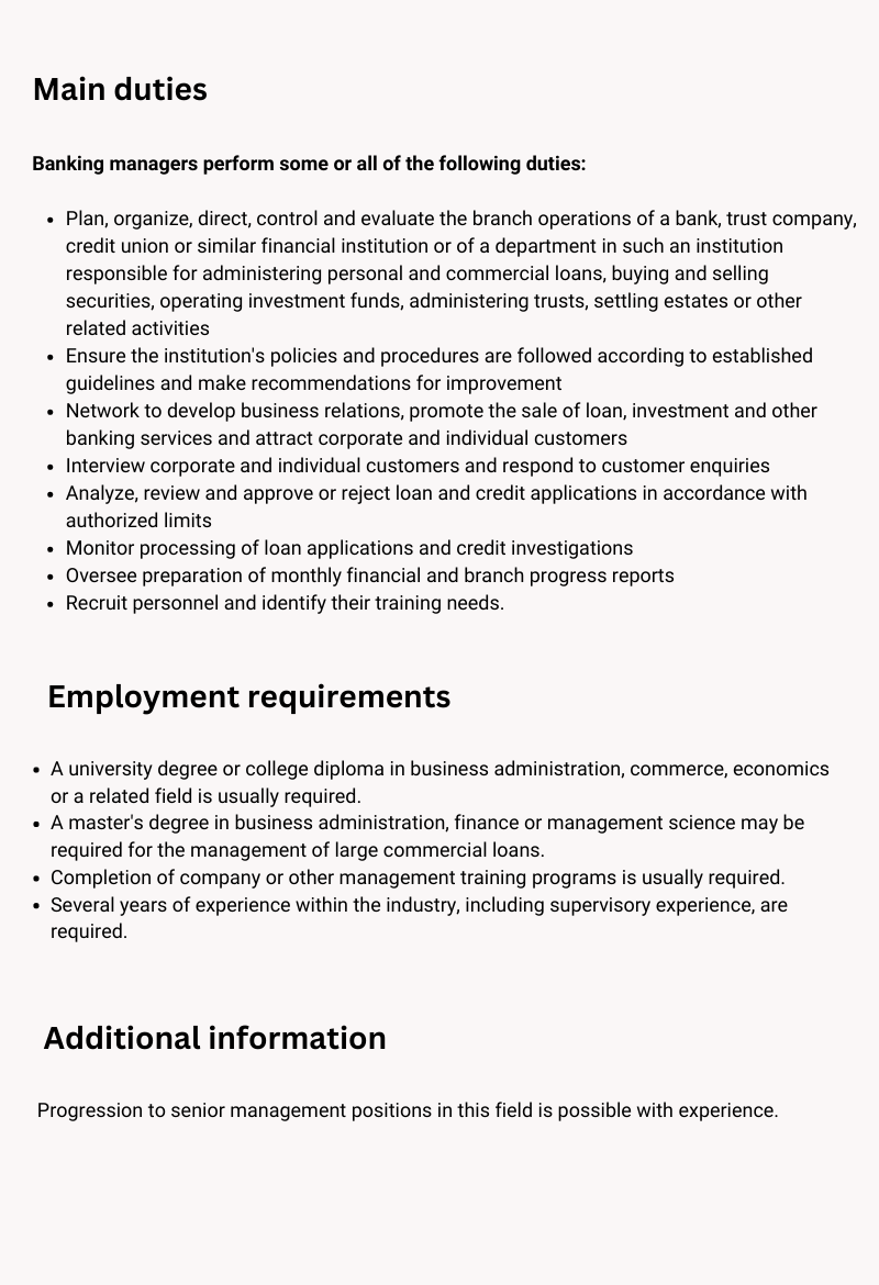 Banking, credit and other investment managers plan, organize, direct, control and evaluate the activities of financial establishments or operational departments within such establishments, or credit departments in industrial and commercial establishments. They oversee business development and manage overall performance in accordance with established strategic directions and policies. Banking managers are employed by banks, trust companies and credit unions. Credit managers are employed by credit departments in department stores, utility companies, car dealerships, insurance companies or other industrial or commercial organizations. Other investment managers are employed by credit card companies, consumer loan companies, mutual fund investment firms, mortgage investment companies or other financial establishments concerned with extending loans and financing and investments.