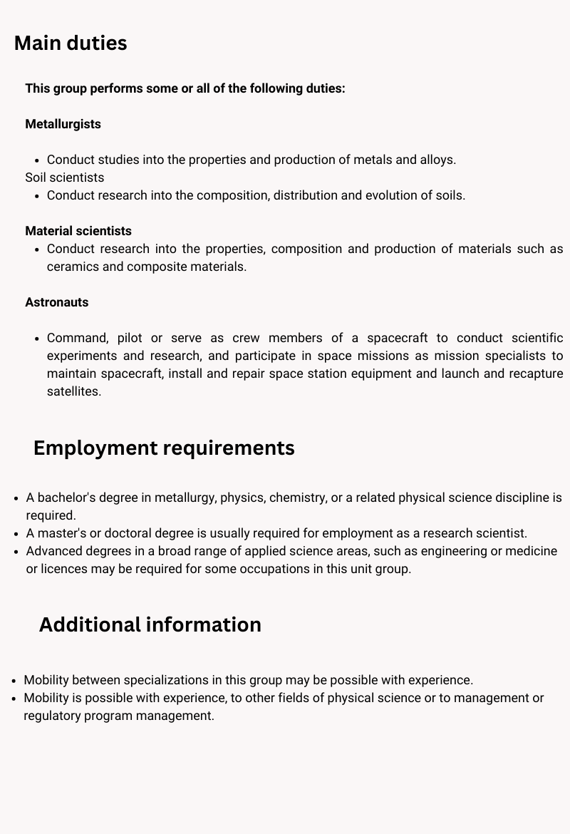 Professionals in other physical sciences occupations conduct theoretical and applied research in fields of physical science. Metallurgists, soil scientists and physical scientists and researchers are included in this unit group. They are employed by governments, educational institutions and a wide range of industrial establishments.