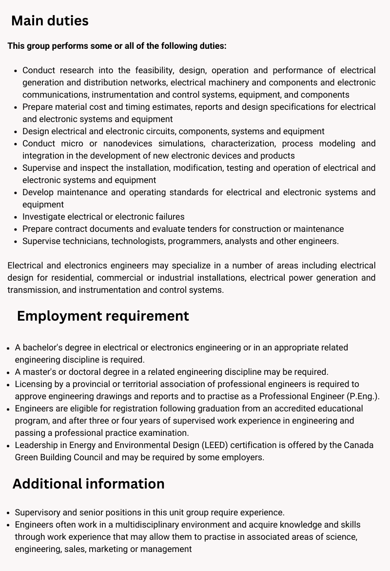 Electrical and electronics engineers design, plan, research, evaluate and test electrical and electronic equipment and systems. They are employed by electrical utilities, communications companies, manufacturers of electrical and electronic equipment, consulting firms, and by a wide range of manufacturing, processing and transportation industries and government.