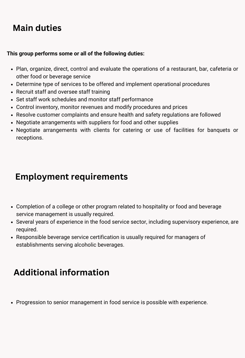 Restaurant and food service managers plan, organize, direct, control and evaluate the operations of restaurants, bars, cafeterias and other food and beverage services. They are employed in food and beverage service establishments, or they may be self-employed.