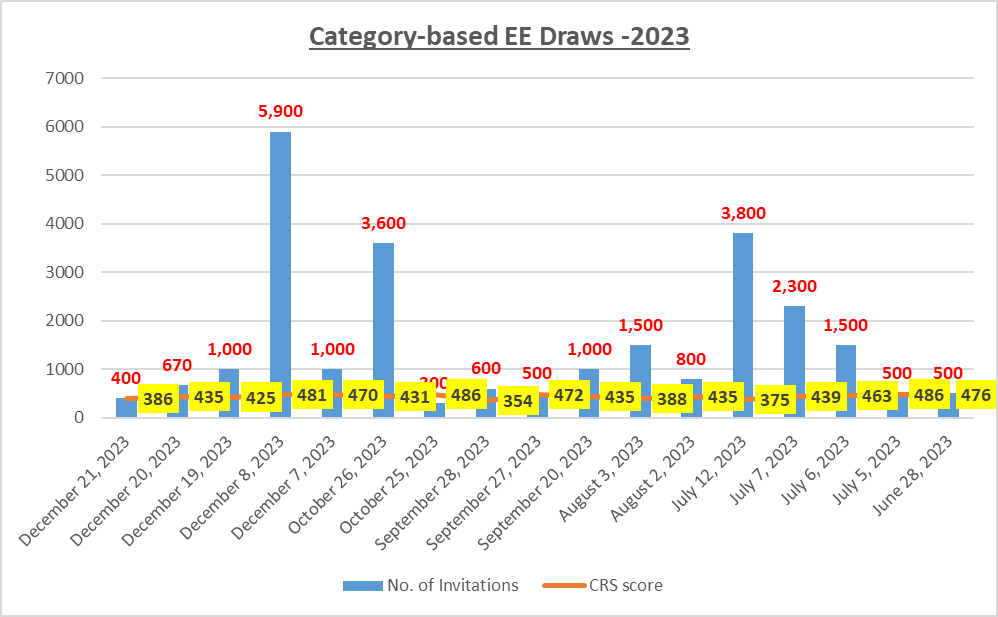 One notable trend in 2023 was the occurrence of category-based draws, with a total of 17 draws inviting significant 25,873 candidates. This offers a unique and beneficial opportunity for applicants, especially considering that Comprehensive Ranking System (CRS) scores tend to be lower in category-based draws.