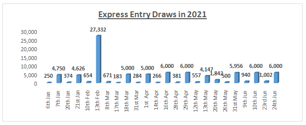 In this draw, the IRCC invited record 27,332 candidates with lowest ever Cut off, i.e. just 75 CRS points. The ITAs issued in first six months this year are by far the highest in any year.