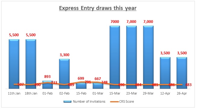 In this latest invitation round of EE system, CRS score CUT OFF dropped to 483 points to invite total 3,500 express entry candidates to apply for Canadian Permanent Residency (PR) Visa. Now after this latest draw, the IRCC has now issued total 44,559 ITAs (Invitations to Apply) for Canadian PR visa this year in total 11 EE draws opened until date.