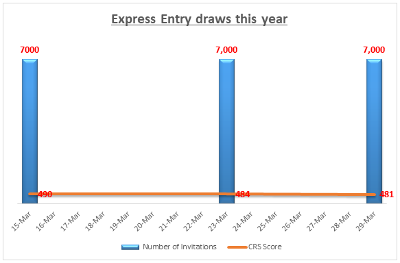 In last three EE draws, the IRCC has issued 7,000 invitations per draw, which is a new record. Moreover, the CRS (Comprehensive Ranking System) score requirement or CUT OFF has also dropped to 481 points from 490 points.