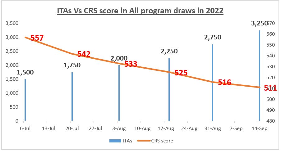 In the biggest Express Entry draw of year held on 14 September 2022, IRCC (Immigration Refugees, and Citizenship Canada) has issued 3,250 Invitations to Apply (ITAs) for Canadian PR (Permanent Resident) Visa.